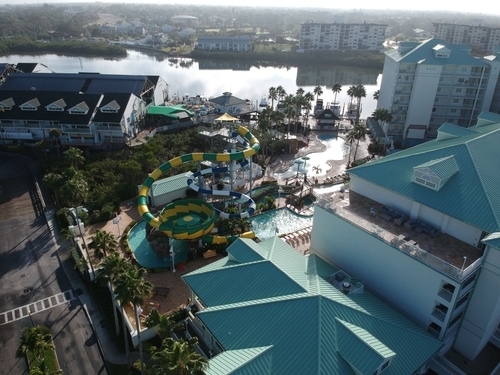 Water park with a variety of slides, kids' splash zones, a lazy river, casual dining & a tiki bar